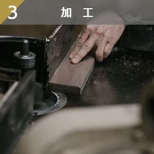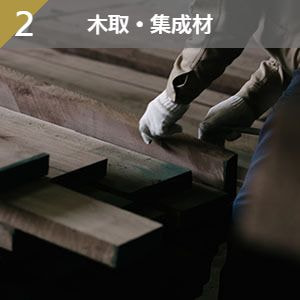 [1. 選別 ] 木材の欠点(ねじれ・割れ・節・虫食い等)を除去し、良質の材を選別します。