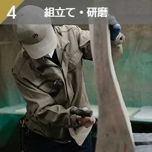 加工された部品を平面、あるいは立体に組み上げます。この工程でほぼ製品の形が出来上がります。長年の経験と技術で歪みなどが無いように組み上げます。