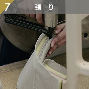 ソファーや椅子に皮革、布、合皮などの表面材を張り込んで仕上げます。それぞれの素材にあった張り方があり熟練を要します。