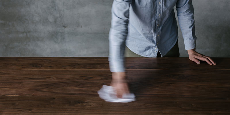 普段のお手入れは、基本的に乾拭きを行って下さい。水拭きをされる場合はよく絞った布を使用し、木部分に水分が残らないにして下さい。